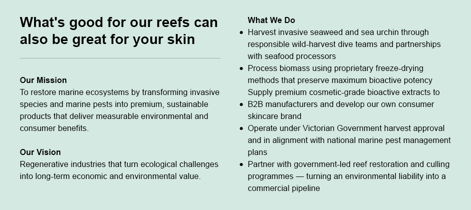 We are a marine restoration company that turns Australia's most destructive invasive species into premium functional bioactive ingredients — actively healing our reefs while we do it.